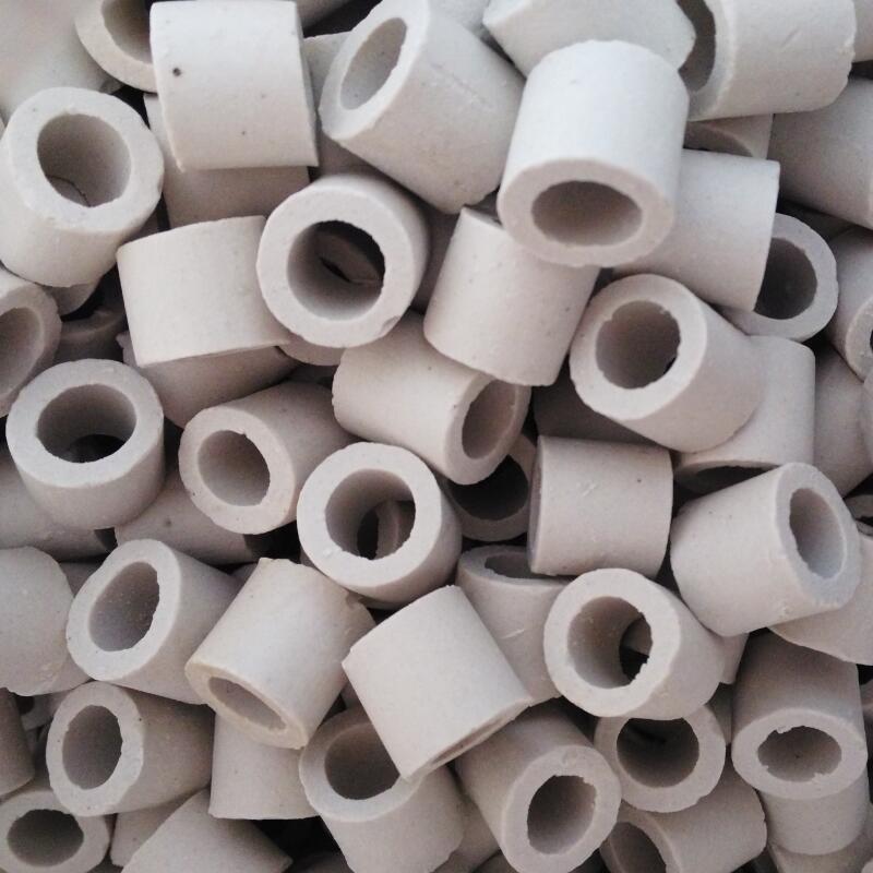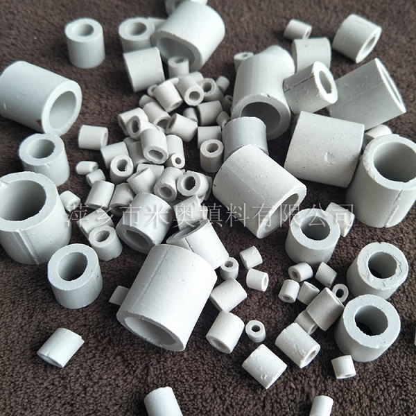 陶瓷拉西環是最早開發的一種散堆填料。陶瓷拉西環的形狀簡單,其高度與直徑尺寸相等。大尺寸的拉西環(100MM以上)一般采用整砌方式規則填充,100mm尺寸以下的拉西環一般采用亂堆方式裝填。